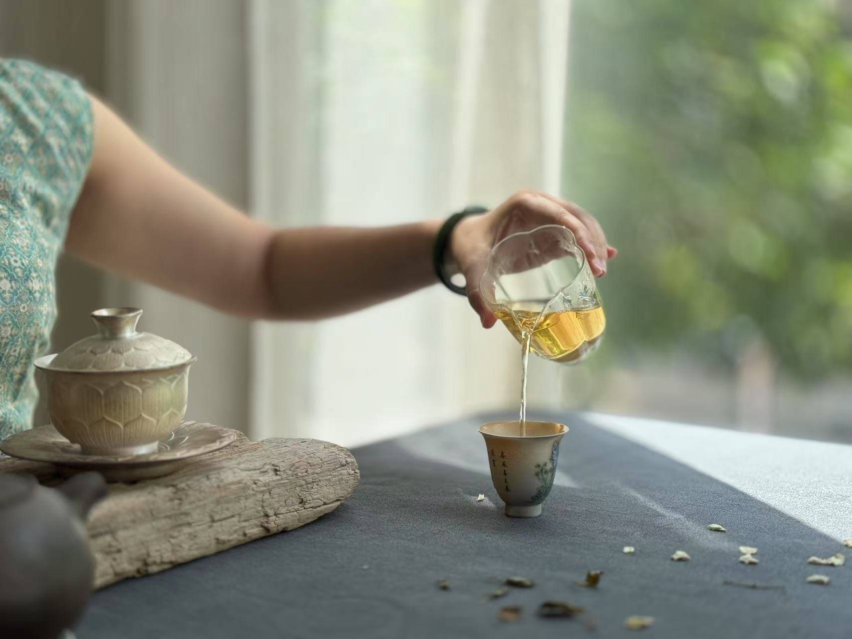 暮秋的阳光透过茶室的窗,洒在桌面的茶具上。