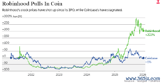 Robinhood股价去年大涨 186%,远超币安 12% 的跌幅。 预测市场业务已成为Robinhood增长最快的收入来源。 币安在进军股票交易和预测市场领域的步伐相对迟缓。深度研究支持