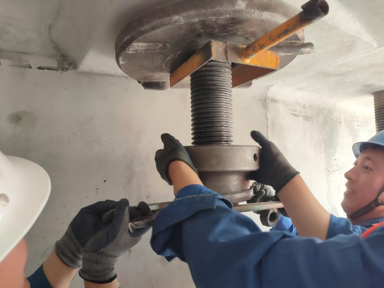 如今,这台“小而精”的装置彻底改写了作业流程。李师傅熟练地将装置推到吊杆下方,先把吊具螺母稳稳放在装置中央的旋转托盘上,搭档再握住两侧的承托框架托举部,轻轻一抬,螺母就精准对准了吊杆下端。“以前得两人瞅着对位,现在这框架一卡就准!”他笑着说,随后单手转动侧边的驱动杆,托盘带着螺母缓缓旋转,不一会儿就稳稳旋入螺栓,整个过程行云流水。